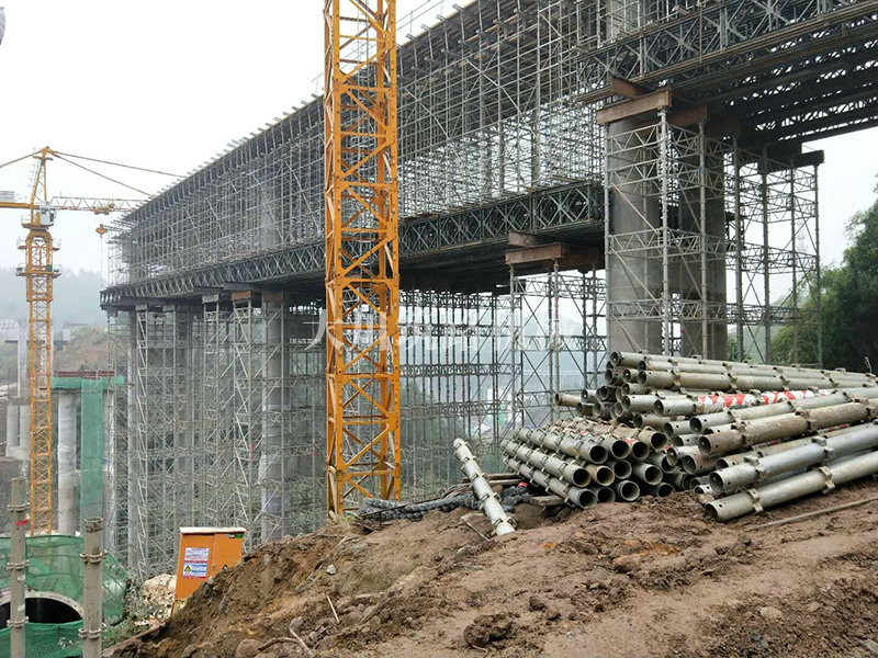 特點:現澆梁支架平臺的跨度大,高度高,使用的貝雷片數量達到1808片,加強弦桿2800根,工程于2017年9月開始施工。